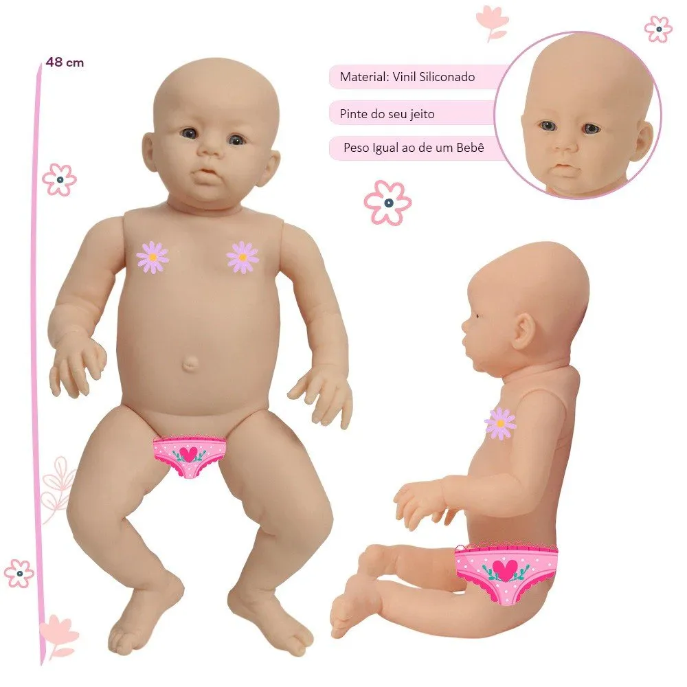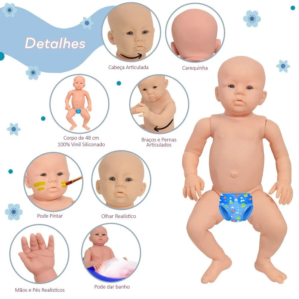 Kit Reborn Menino Abigail de 48 cm com corpo, cabeça, membros e olhos. Produzido em vinil siliconado atóxico, ideal para pintura e personalização realista.