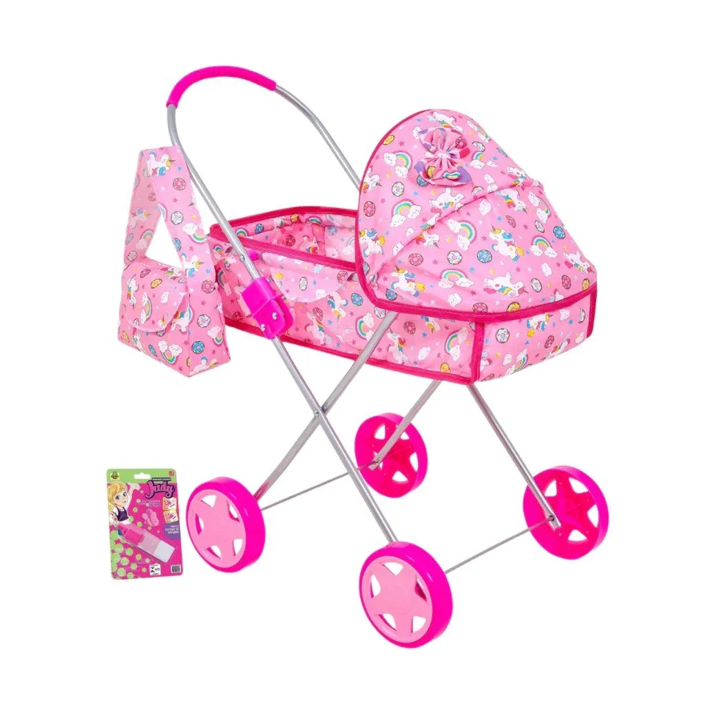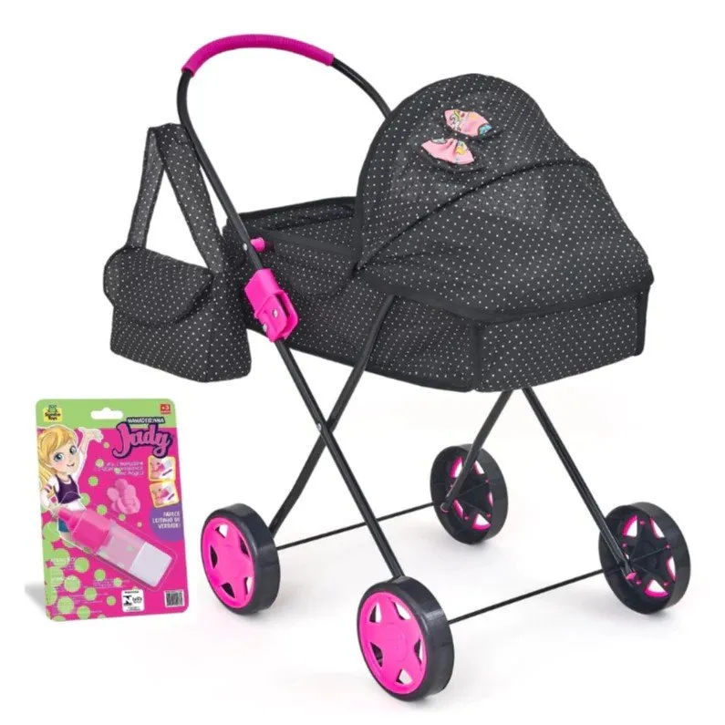 Com estrutura em metal, tecido e plástico resistente, o carrinho é leve, dobrável e fácil de manusear. Possui capota reclinável, bolsa lateral e mamadeira inclusa, tornando-se um kit completo para brincadeiras e exposições de bonecas Reborn de até 53 cm.