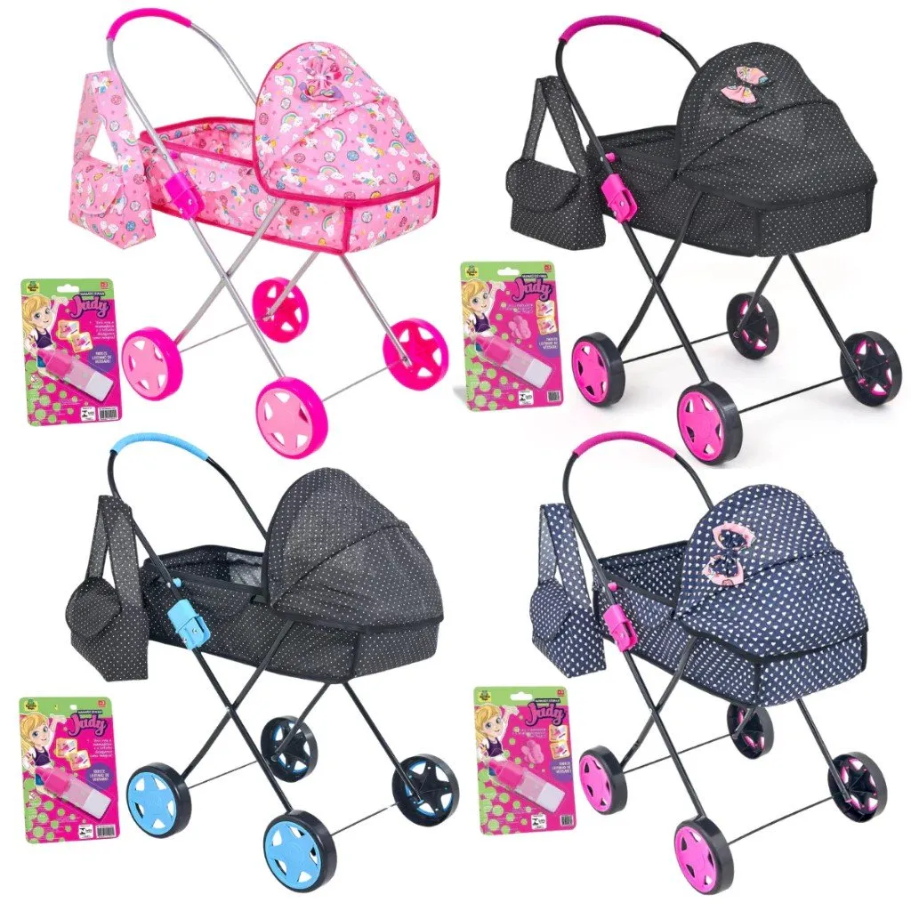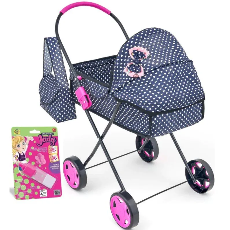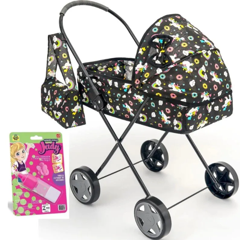 - Carrinho de boneca tipo berço com bolsa e mamadeira inclusas.